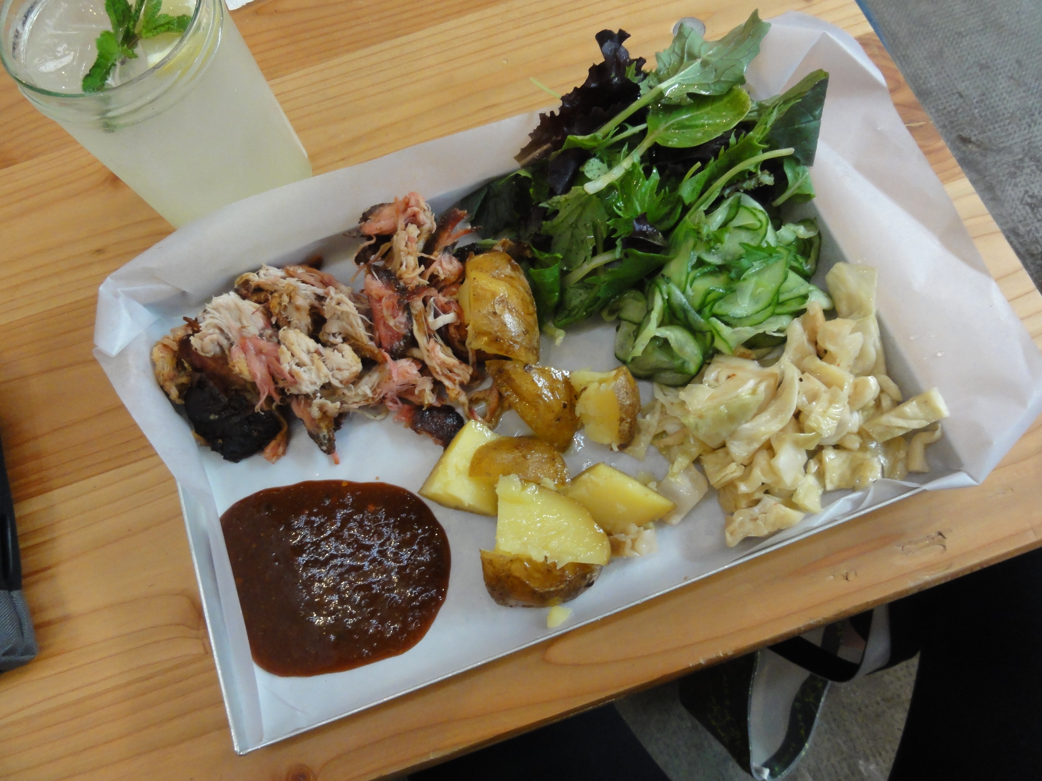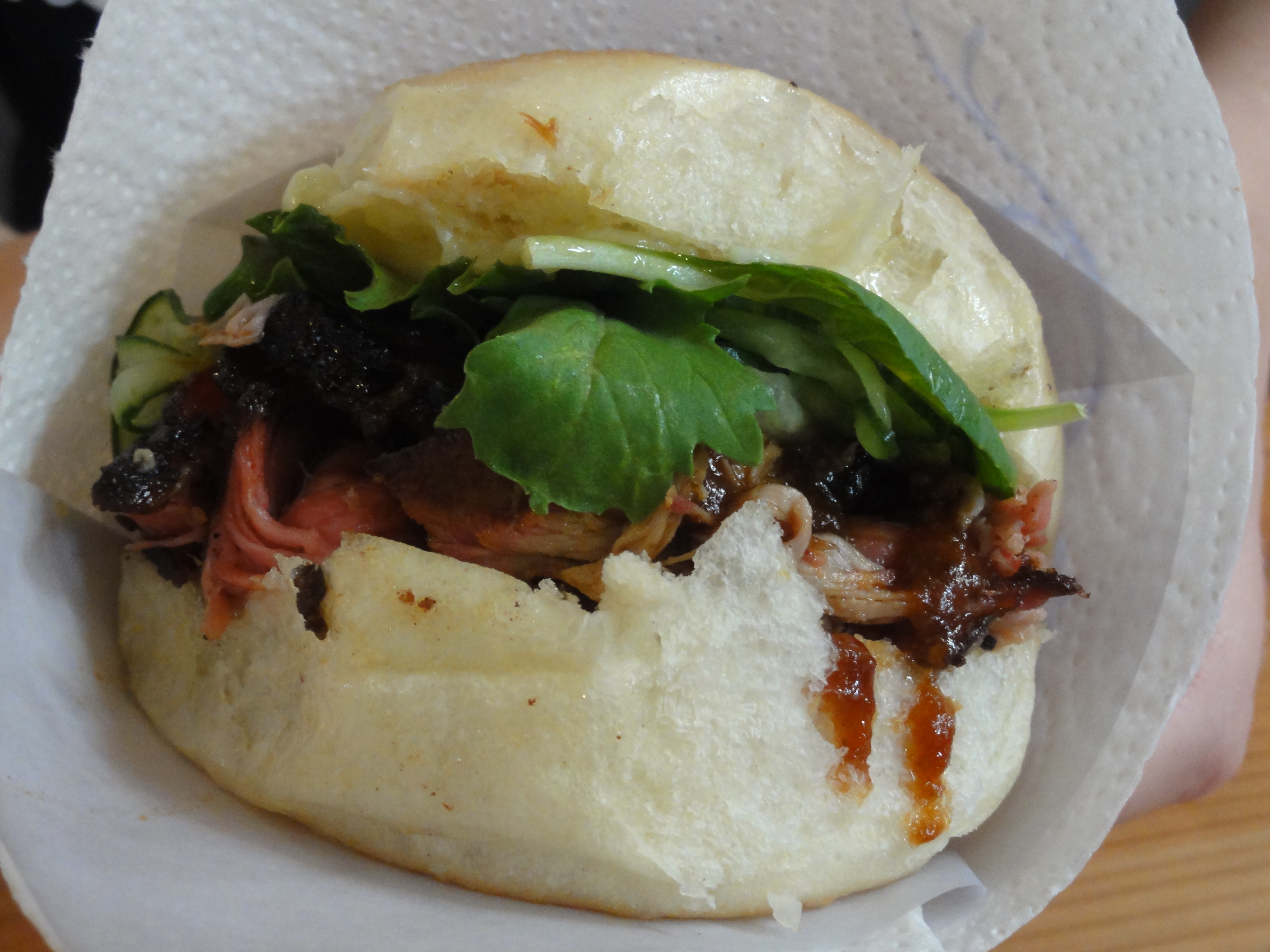 Zuerst habe ich mir ein Pulled Pork Sandwich plus Käse bestellt. Man kann aus 3 verschiedenen selbstgemachen Grillsaucen wählen. Sauerkraut kommt auf Wunsch auch noch rein und kleine Apfelstücke runden den Geschmack ab.