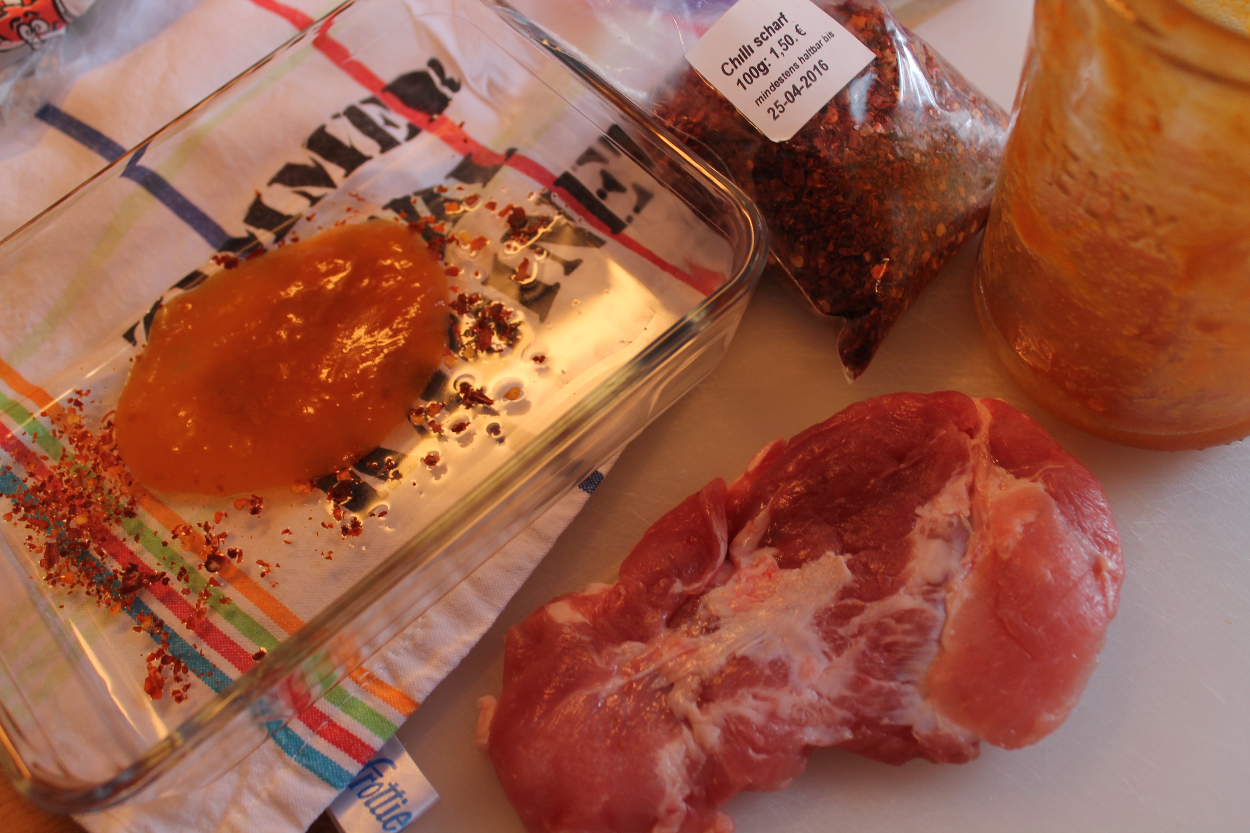Als Marinade verwende ich 2 EL Distelöl, 2 EL selbstgemachte Marillenmarmelade, Salz und Chilliflocken. Das Fleisch habe ich 24h gekühlt in der Marinade liegen lassen.