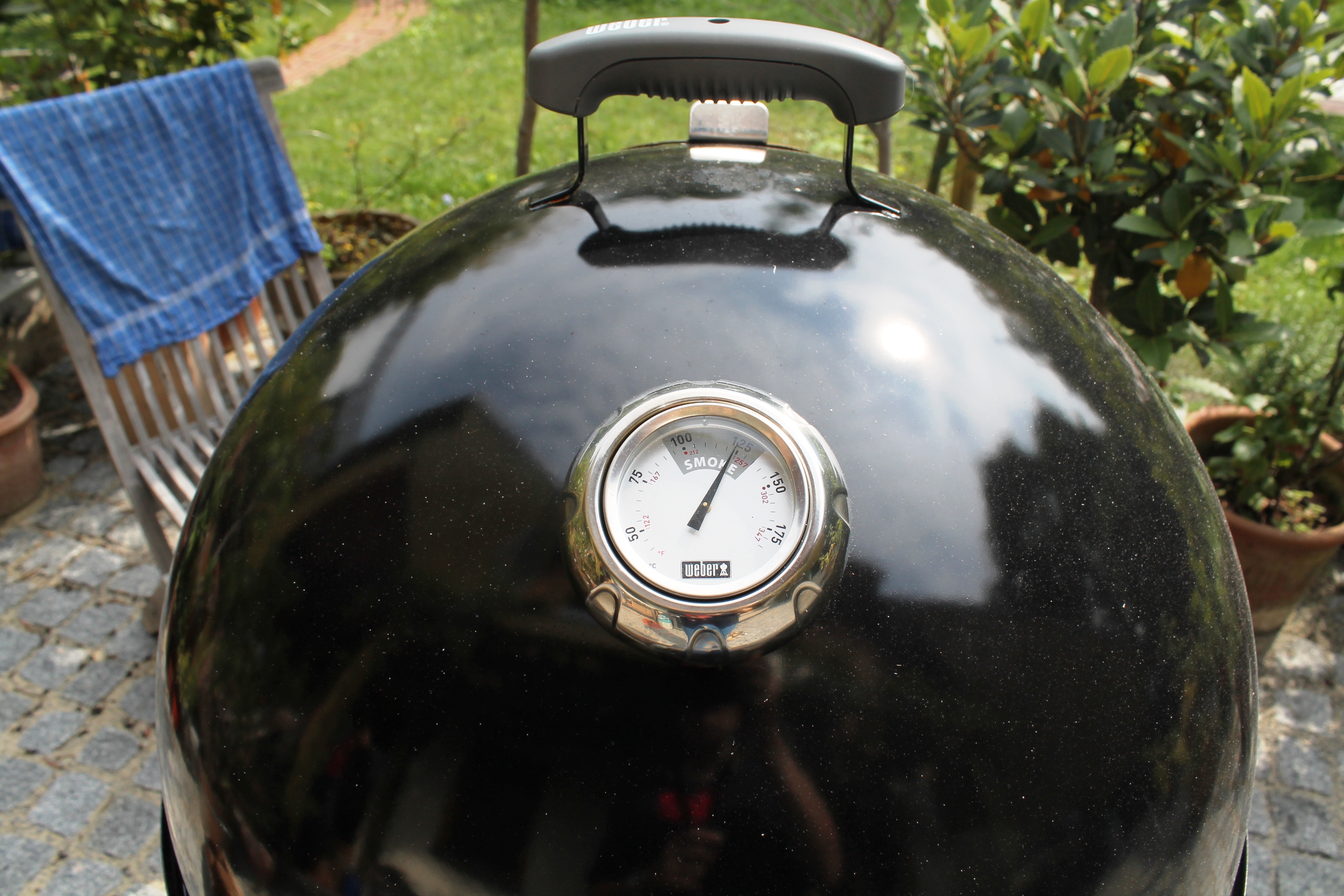 Sobald der Water Smoker seine Betriebstemperatur erreicht hat, kann das Fleisch auf den Rost gelegt werden. Die ideale Temperaturzone liegt zwischen 90 Grad und 125 Grad. Temperaturen zwischen 30 Grad und 80 Grad sind gefährlich und sollten unbedingt vermieden werden, da sich in diesem Temperaturbereich Bakterien explosionsartig vermehren. Daher ist es wichtig, die Temperatur und somit den Water Smoker nicht aus den Augen zu lassen. Natürlich muss man nicht 10h vor dem Smoker sitzen, man kann sich zum Beispiel auch einem guten Buch widmen, Rasenmähen, sich etwas kochen, da man vom ausströmenden Duft 100%ig richtigen Hunger bekommt.