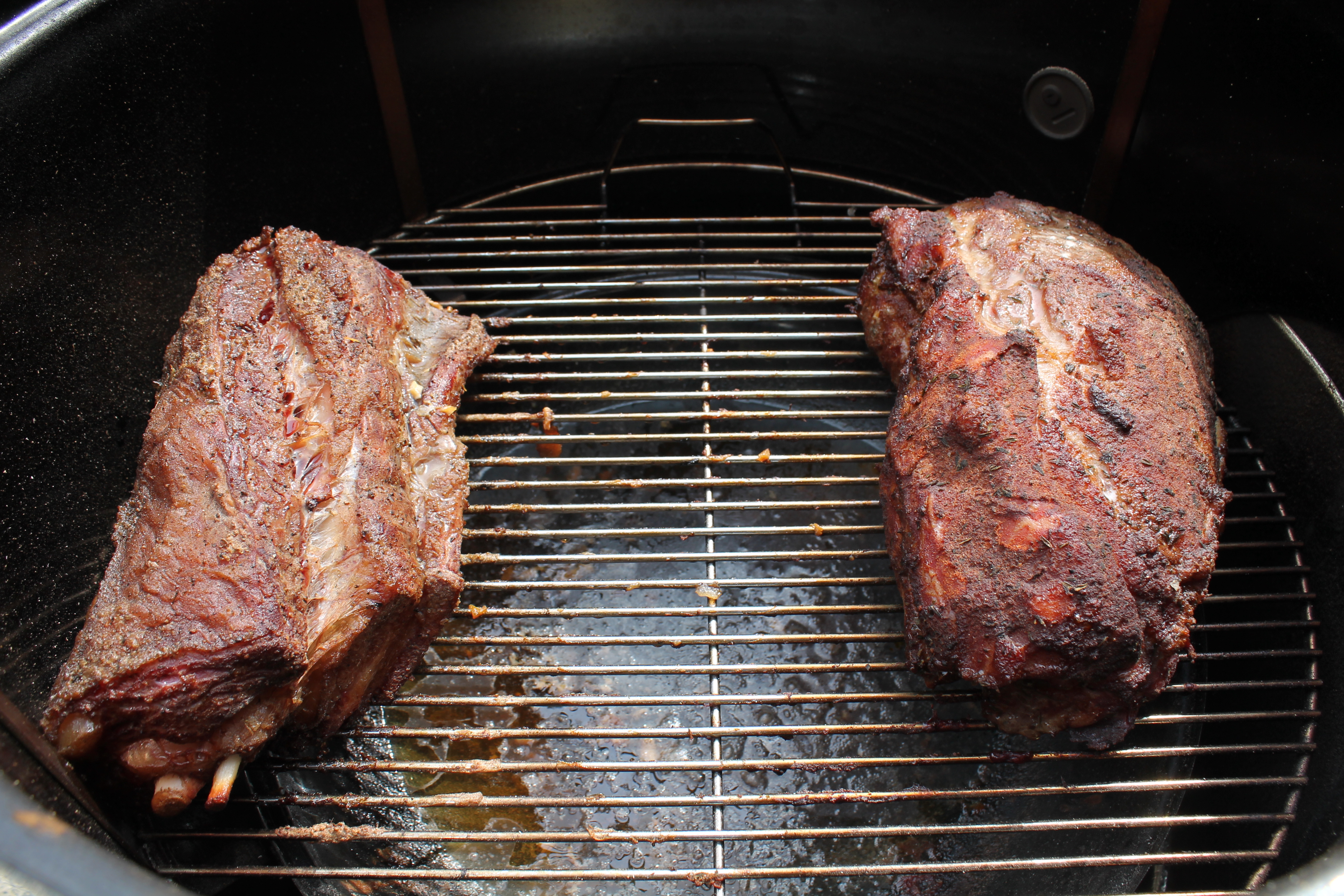 Für mein Fleischduell am Water Smoker habe ich 2 kg Beinfleisch vom Jungstier und 3kg Schopfbraten beim Fleischer meines Vertrauens vorbereiten lassen. Das Beinfleisch inklusive Knochen, ganz klassisch, wie man es auch zum Kochen einer guten Rindsuppe verwendet. Für die Würzung des Beinfleischs habe ich ausschließlich Salz & Pfeffer benutzt, das ursprünglichste Rub! Wenn die Fleischqualiät stimmt, braucht man wirklich nicht mehr. Wer schon einmal in den USA BBQ gegessen, hat wird mir wahrscheinlich zustimmen. Die Amerikaner übertreiben es für mich persönlich mit dem Würzen, oftmals kann man den eigentlichen Fleischgeschmack nur erahnen, da z.B. über Ribs literweise klebrig-süße Sauce gegossen wird. Ich bevorzuge den vollen Fleischgeschmack ohne viel Schnick-Schnack.