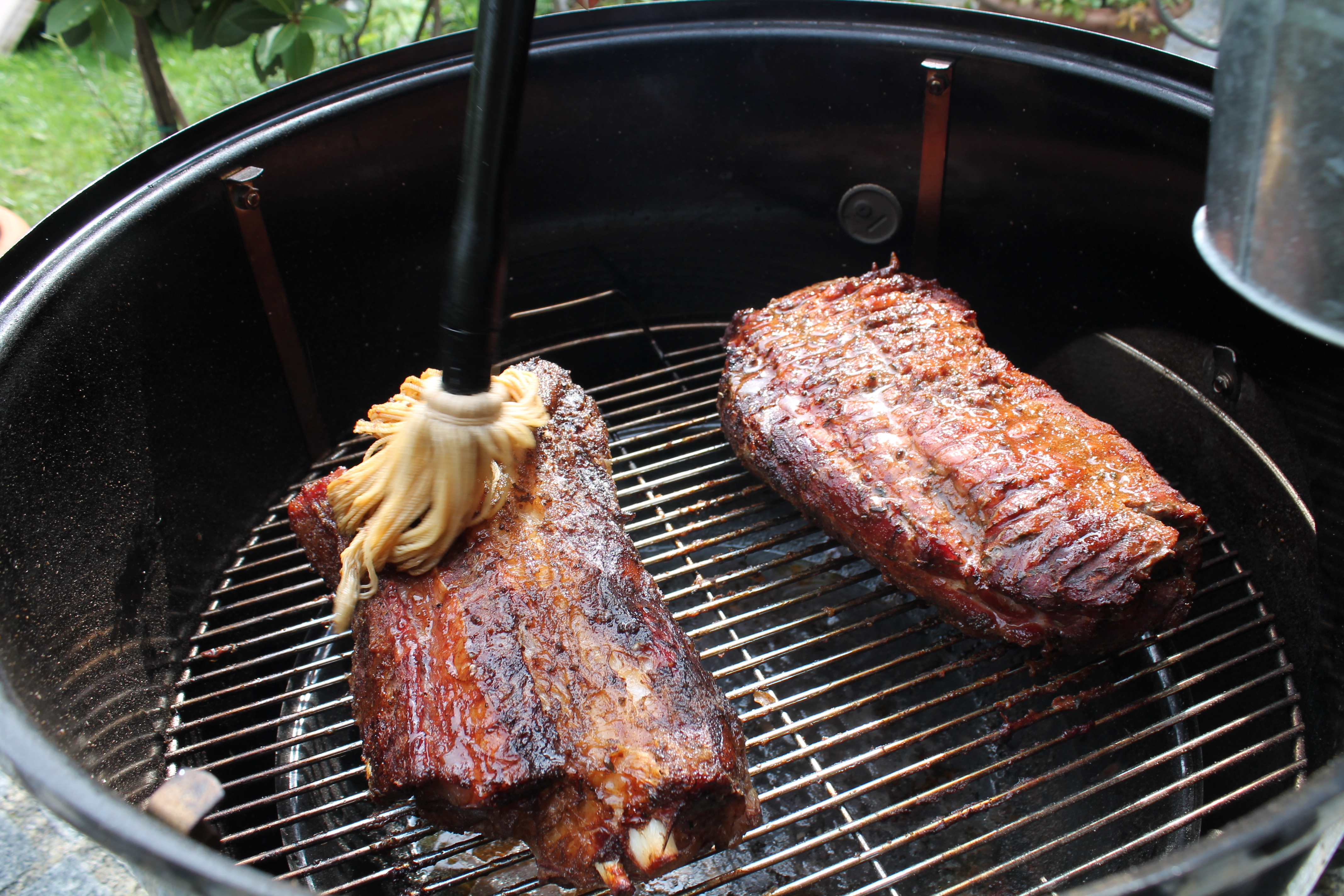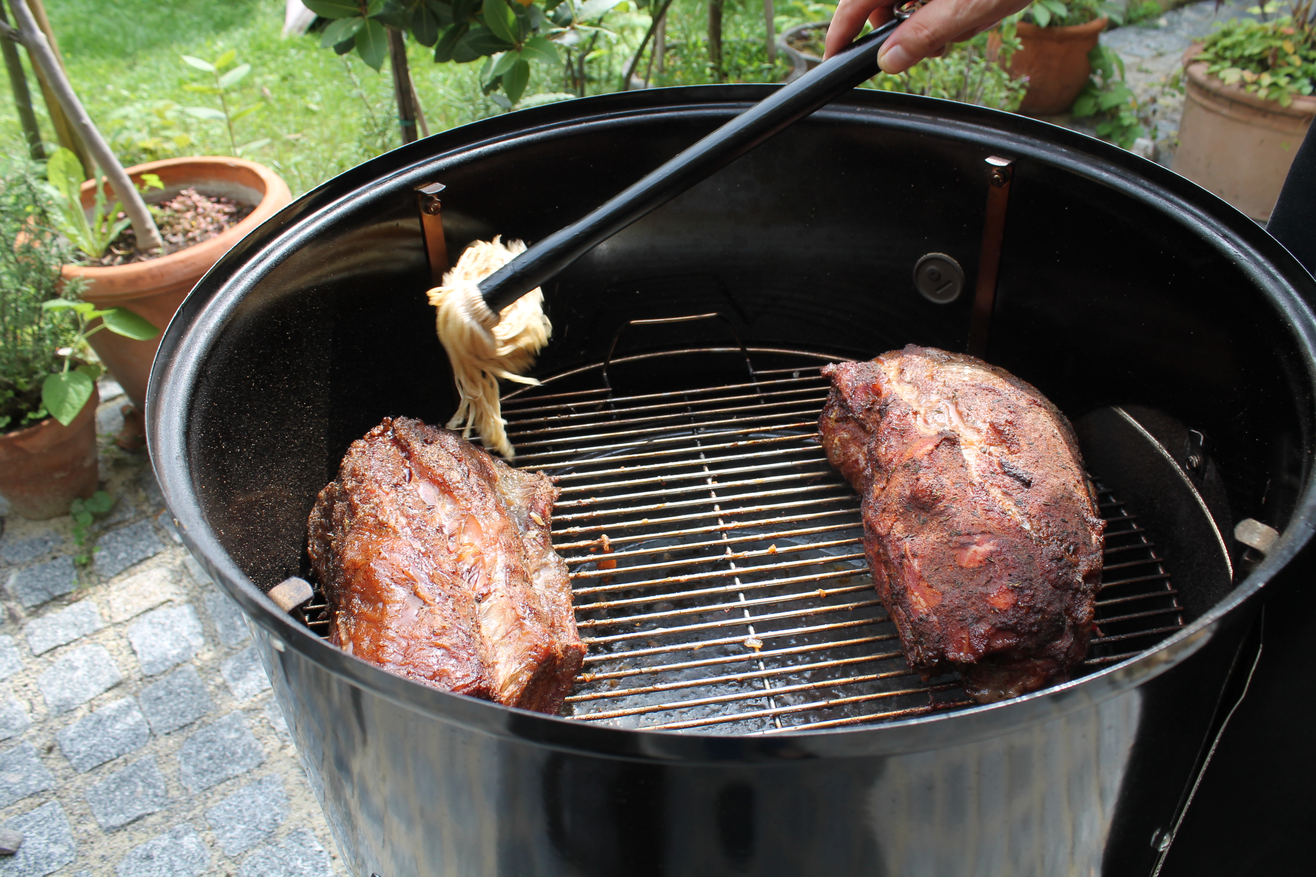 Tipp: Stellt euch einen Wecker im Stundentakt. Regelmäßig muss heißes Wasser in die Wasserschale gefüllt & Kohle nachgelegt werden, damit die Hitze konstant bleibt. Ein Thermometer, um die Fleischtemperatur zu messen darf beim Smoken keinesfalls fehlen, denn die Kerntemperatur entscheidet, wann ihr den Braten anschneiden könnt. Von Zeit zu Zeit bzw. je nachdem wie intensiv ihr den Rauchgeschmack wollt, Holzchips direkt auf die Kohlen legen. Nach ca. 2h kann auch mit dem Moppen begonnen werden. Das Moppen gibt dem Fleisch Geschmack und schützt es vorm Austrockenen.