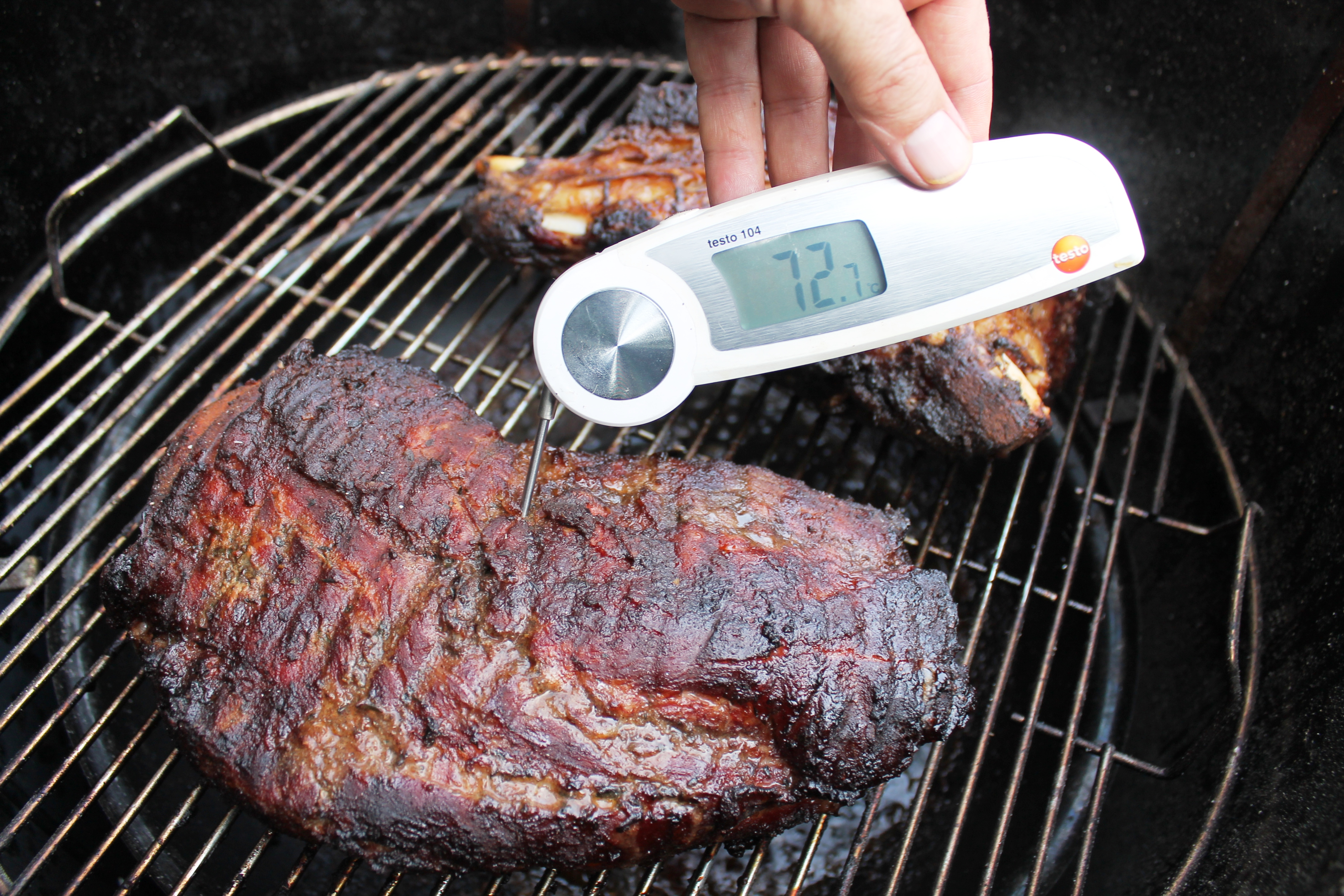 Irgendwo zwischen 70-75 Grad Kerntemperatur schlittert man in die unbeliebte Plateauphase. Die Kerntemperatur steigt nicht mehr an, die Umwandlung pro Fleischart kann unterschiedlich lang sein. Die Plateauphase ist nichts für Ungeduldige. Sucht euch eine Beschäftigung und lasst den Deckel zu, sonst fällt die Temperatur ab und es dauert es noch länger 🙂