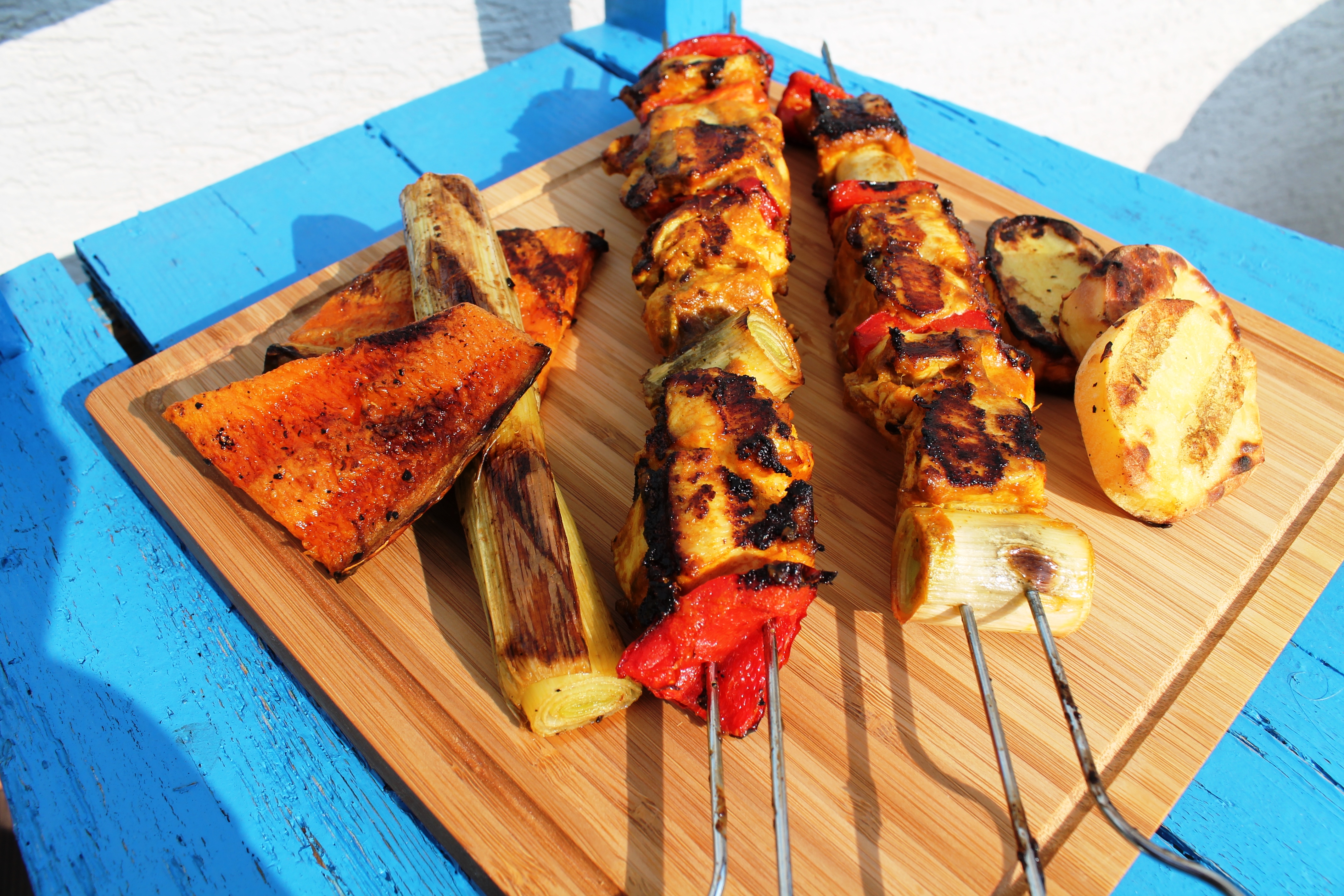 Nach ca. 10min die Hühnerspieße, Kürbis und Porree auflegen. Die Hühnerspieße im 5 Minutentakt wenden und zum Schluss bei indirekter Hitze weitergrillen.