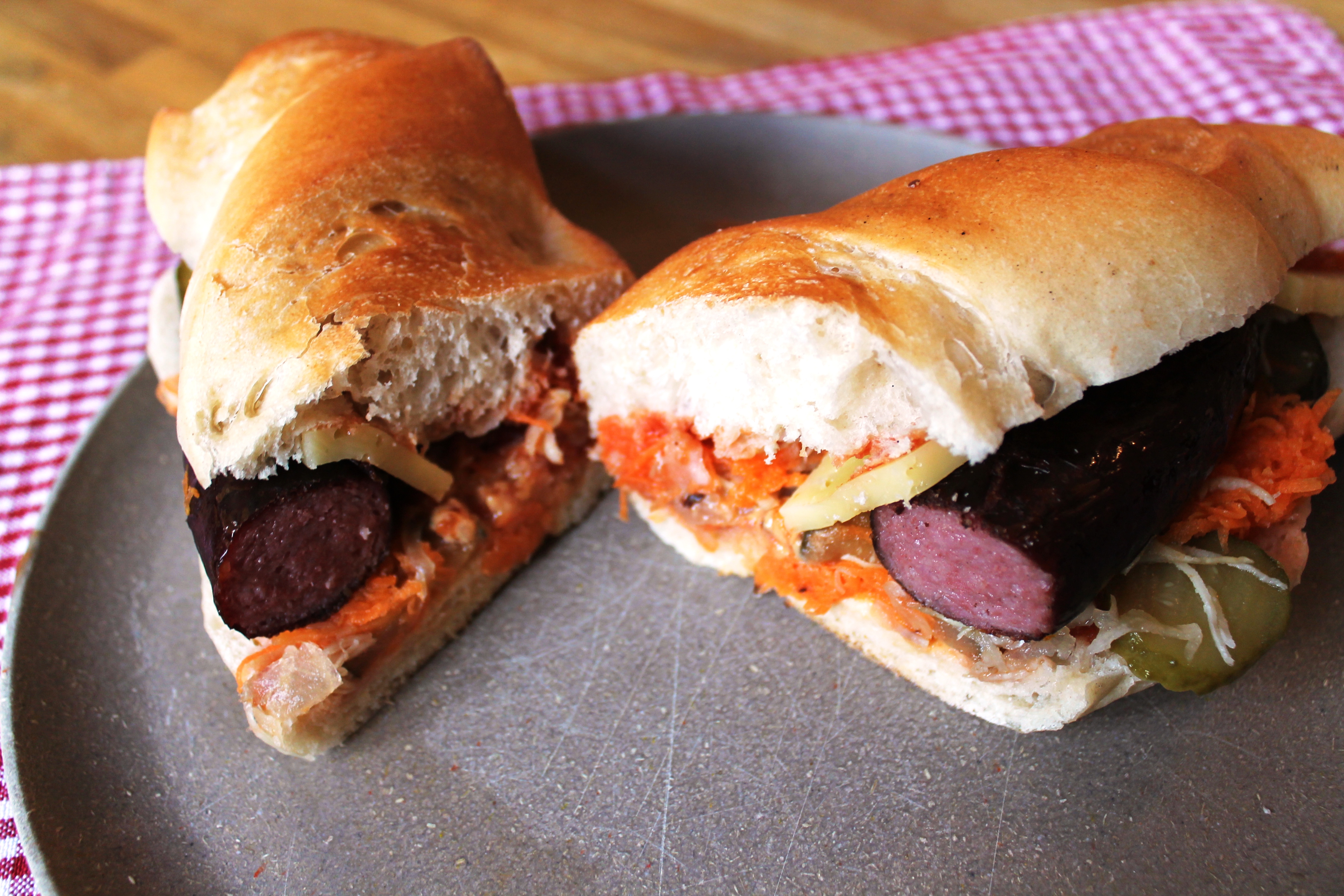 Das Brot mit den oben erwähnten Zutaten nach Lust und Laune belegen, die Wurst oben drauflegen und einmal in der Mitte
