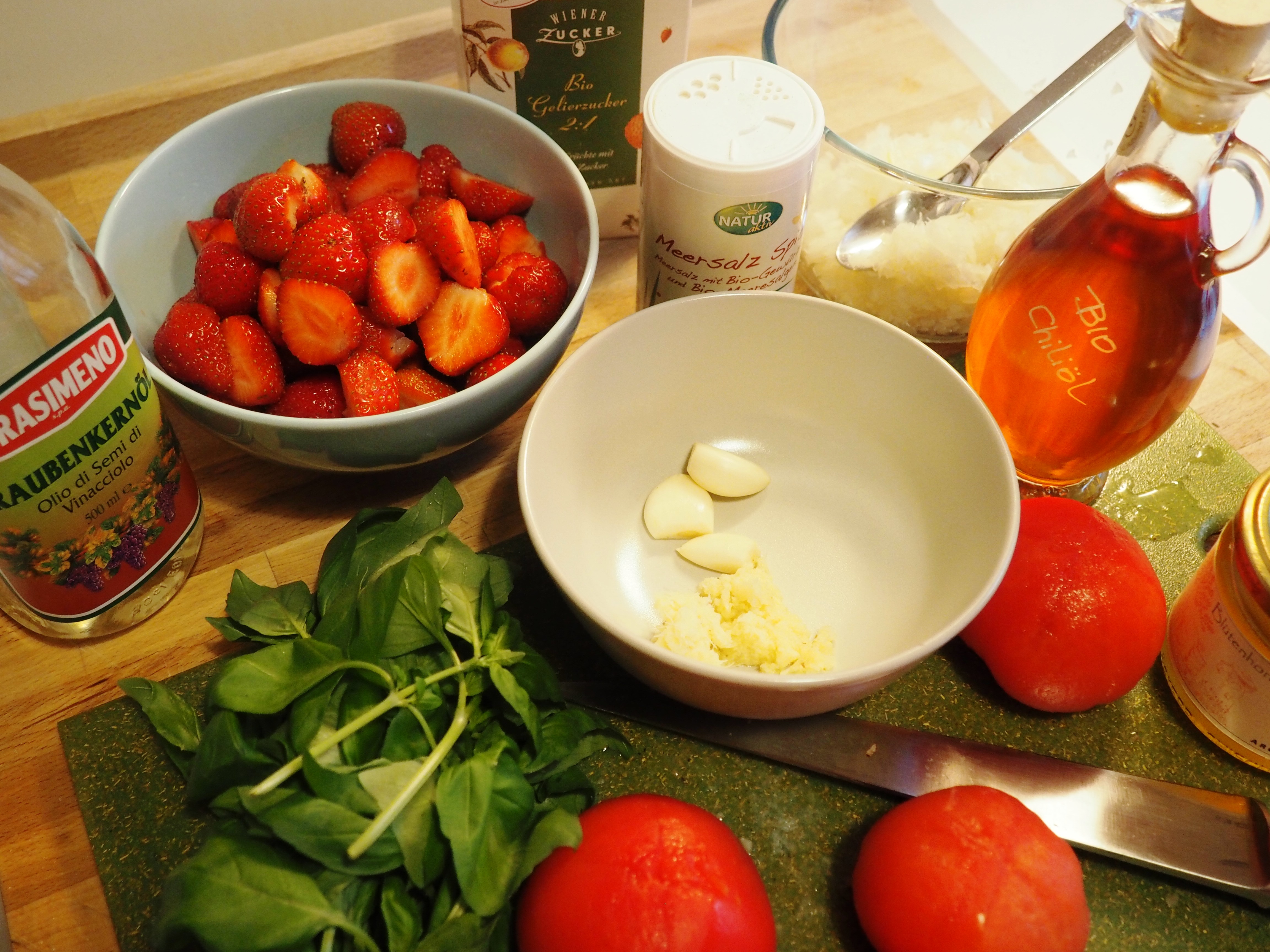 In der Zwischenzeit die Tomaten mit einem Messer einritzen und Wasser im Wasserkocher erhitzen. Die Tomaten in einen Topf legen, das kochende Wasser über die Tomaten schütten und kurz warten. Kalt abschrecken und die Haut mit einem Messer abziehen. Die Tomaten in Stückchen schneiden und zu den Erbeeren geben. Mit Dattelessig und Balsamico ablöschen und weiterkochen lassen. Ingwer, Knoblauch, Tomatenmark, Salz & Peffer dazugeben. Circa 10min kochen lassen. Dann Gelierzucker unterrühren und nochmals 10min köcheln lassen bis die Masse sämig wird.