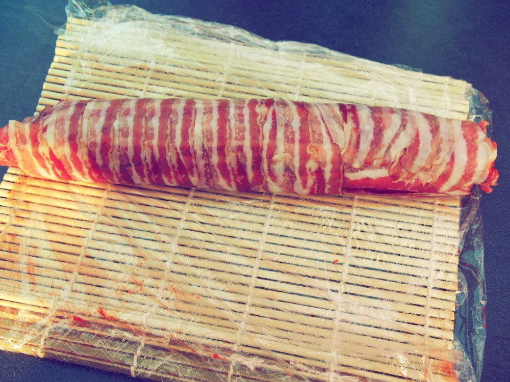 Zuerst die Sushi-Roll-Matte mit Klarsichtfolie umwickeln, damit später nichts daran kleben bleibt. Nun den feingeschnittenen Speck (10dag/Rolle) gleichmäßig und genau auf der Sushi-Roll-Matte auslegen. Das Faschierte mit dem Bio-Ei vermischen und mit frischen feingehackten Kräutern, Salz und Pfeffer aus Mühle würzen. Ich habe gemischtes Faschiertes verwendet, weil es saftiger wird.