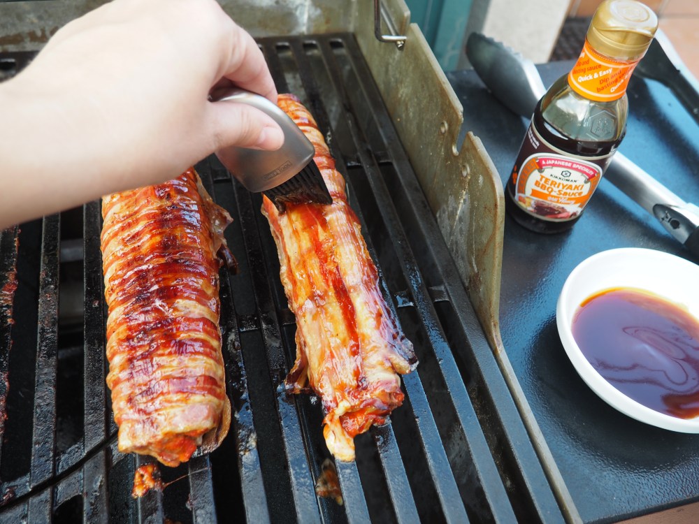 Die Rollen für ca. 25 min auf dem Grill lassen und 1-2-mal drehen, damit der Speck rundherum knusprig wird. Dann mit der BBQ-Sauce bestreichen und nochmals 5min grillen. Diesen Vorgang nochmals auf der anderen Seite der Rolle wiederholen.