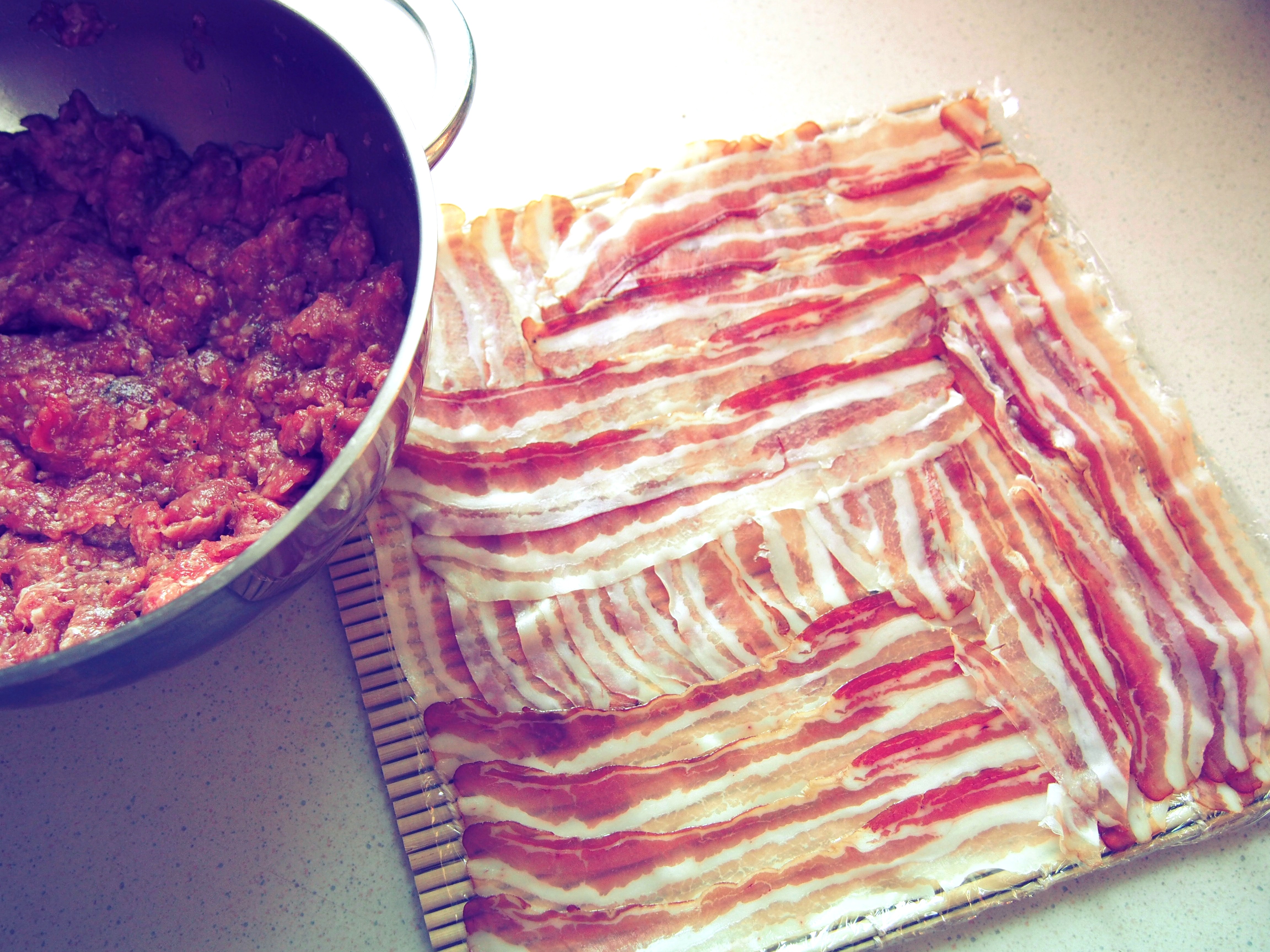 Zuerst die Sushi-Roll-Matte mit Klarsichtfolie umwickeln, damit später nichts daran kleben bleibt. Nun den feingeschnittenen Speck (10dag/Rolle) gleichmäßig und genau auf der Sushi-Roll-Matte auslegen. Das Faschierte mit dem Bio-Ei vermischen und mit frischen feingehackten Kräutern, Salz und Pfeffer aus Mühle würzen. Ich habe gemischtes Faschiertes verwendet, weil es saftiger wird.