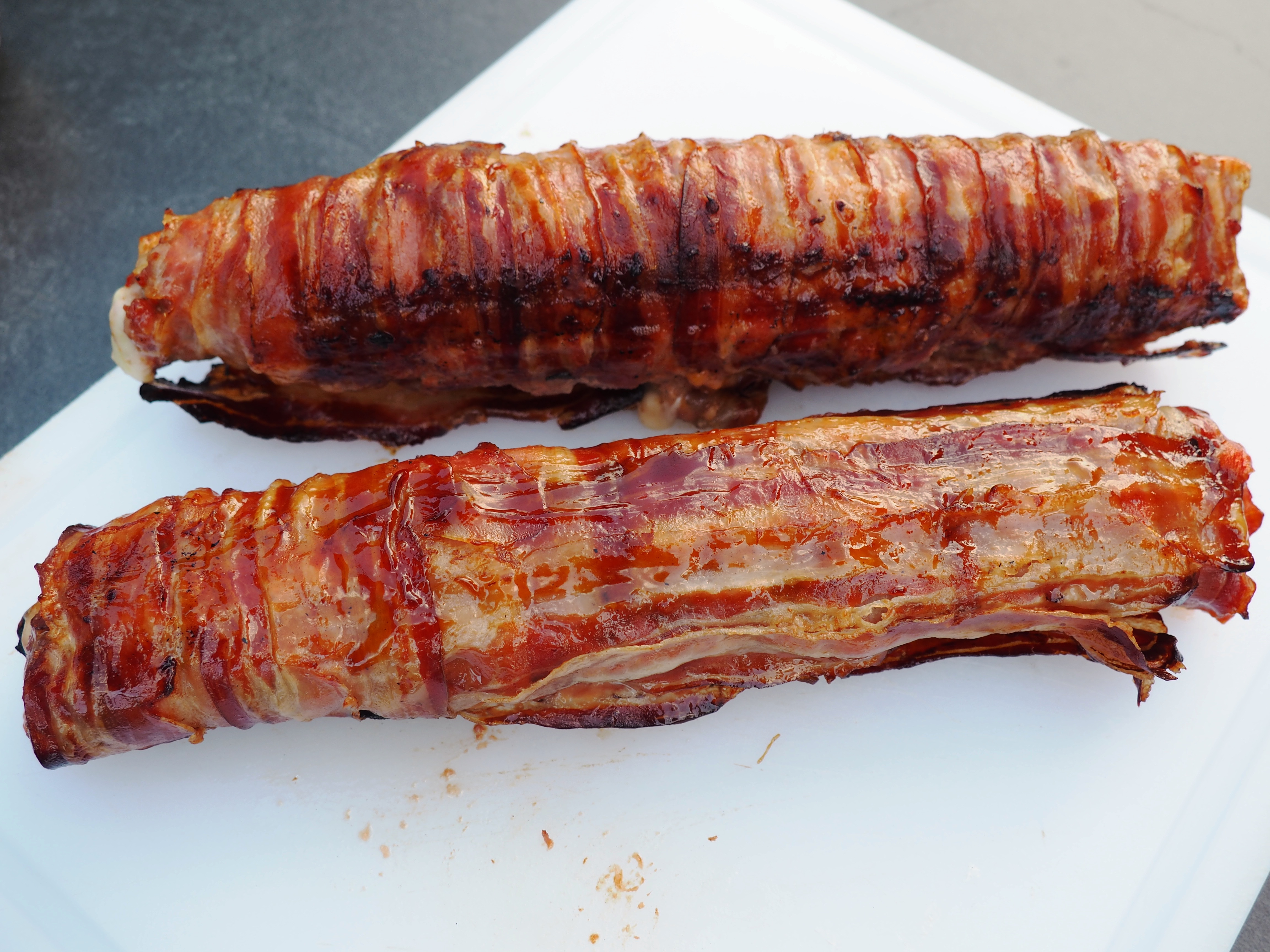 Die Rollen für ca. 25 min auf dem Grill lassen und 1-2-mal drehen, damit der Speck rundherum knusprig wird. Dann mit der BBQ-Sauce bestreichen und nochmals 5min grillen. Diesen Vorgang nochmals auf der anderen Seite der Rolle wiederholen.