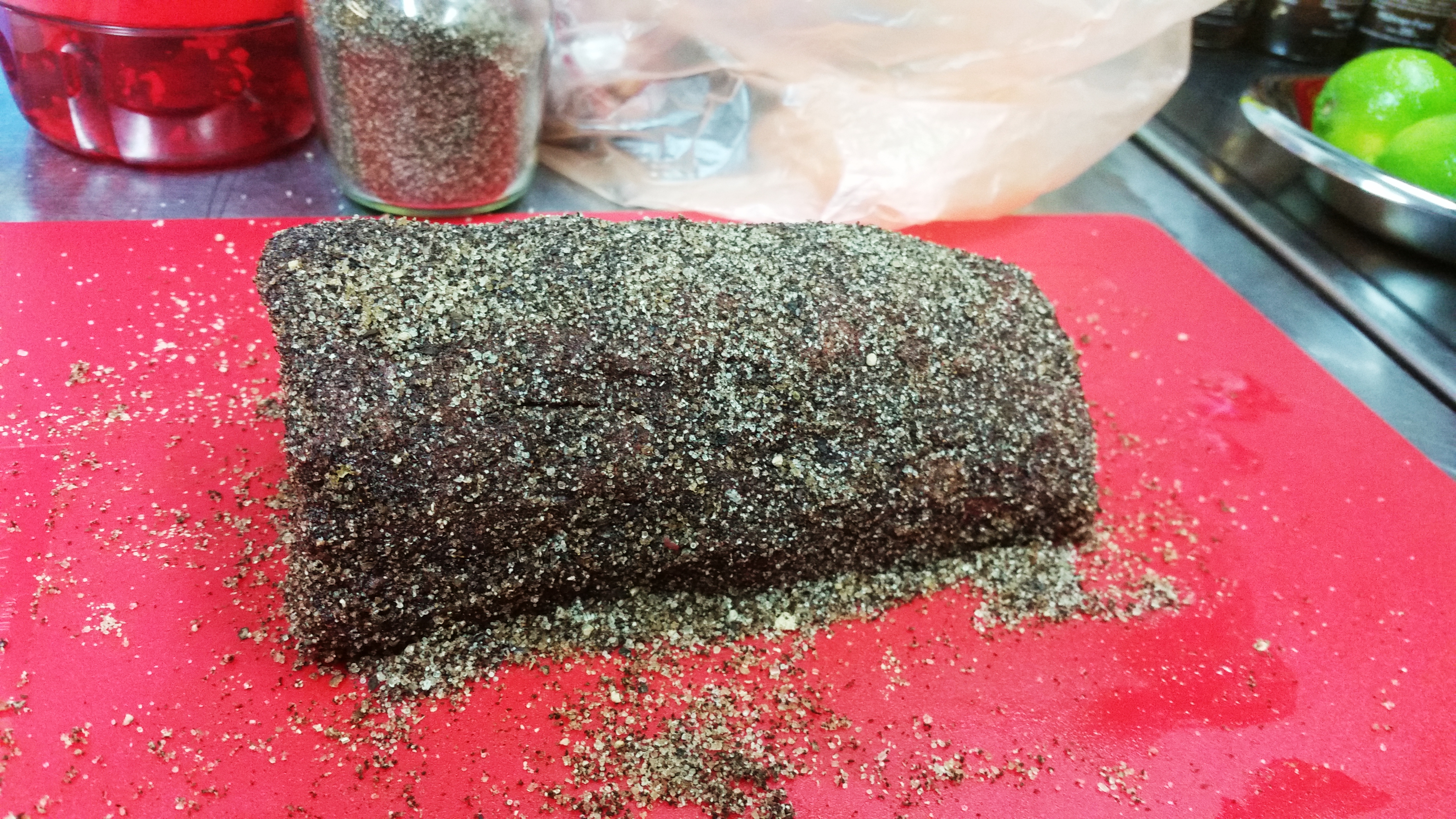 Das Rinderfilet mit Öl benetzten und das Rub großzügig darauf vereilen. Die minimale Einwirkzeit des Coffee Rubs liegt bei 1h.