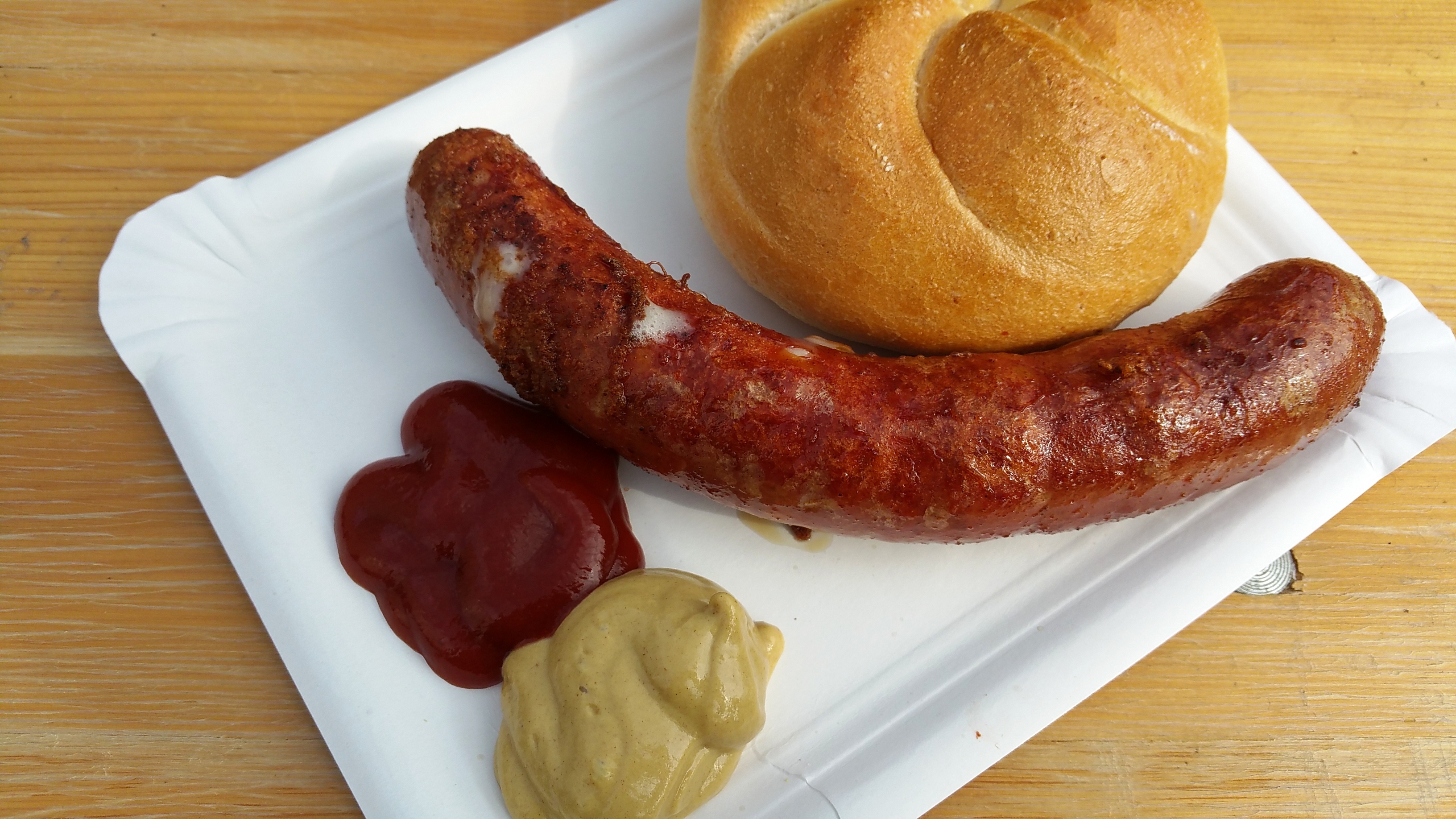Dieses Wochenende findet beim Hauptgebäude in Schönberg auch ein Ostermarkt mit regionalen Ausstellern statt. Da habe ich natürlich gleich die knusprige Straußenkäsekrainer probieren müssen.